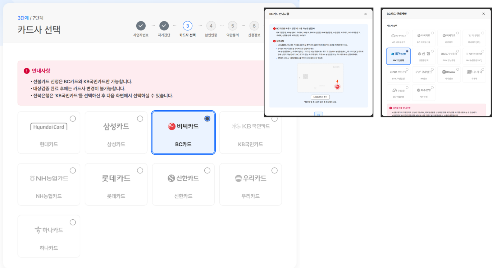 - 카드사 선택: 바우처를 사용할 카드를 선택합니다. 저는 비씨(IBK기업은행)를 선택했어요.