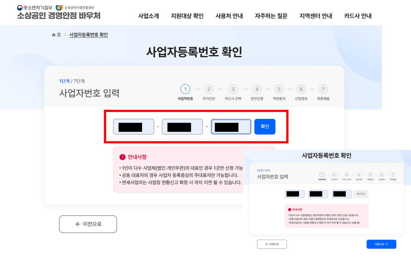 - 사업자등록번호 확인: 소상공인 경영안정 사이트에서 [바우처신청] 배널를 누른 후 사업자번호를 입력하고 확인 버튼을 누릅니다.