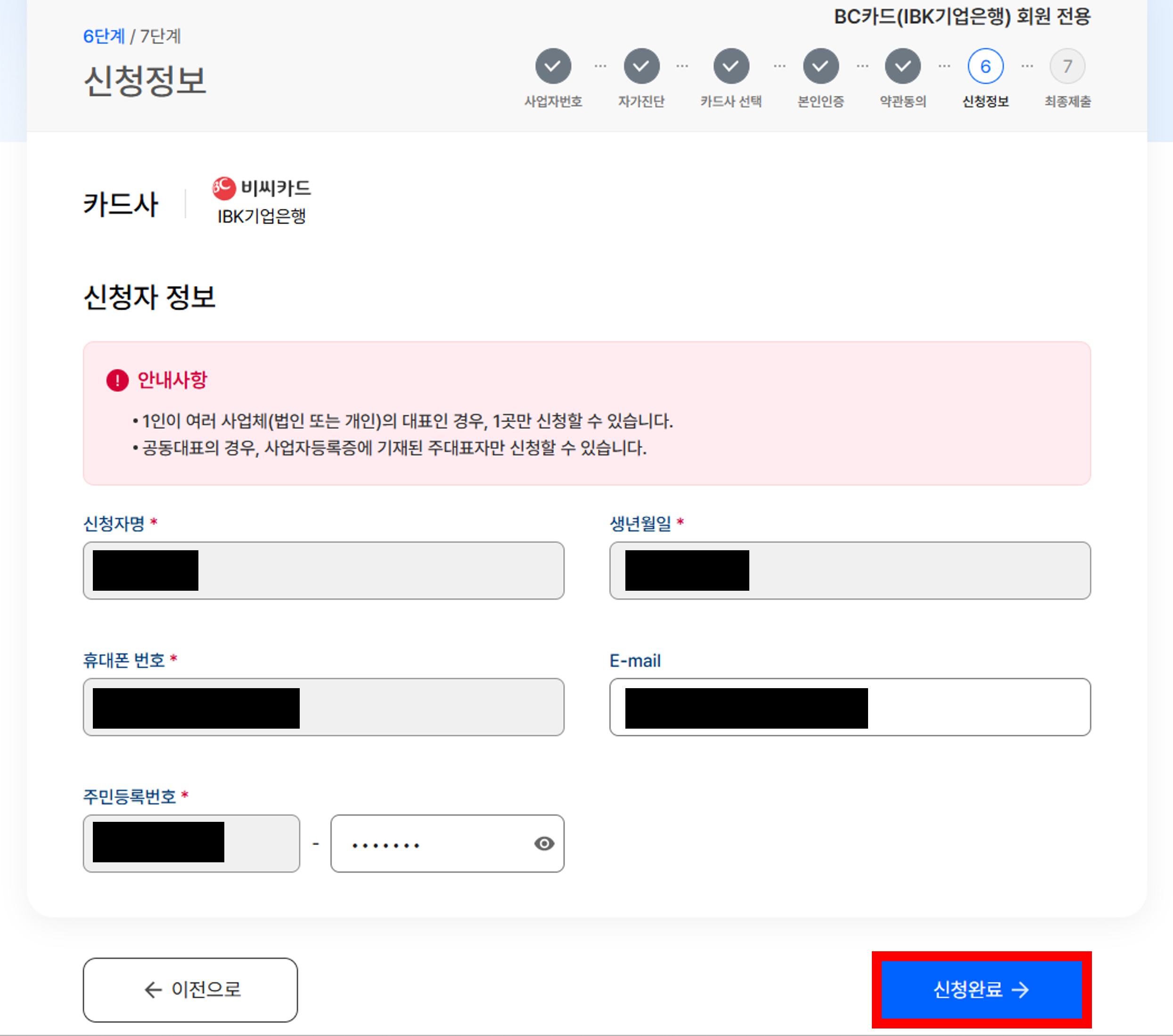 - 신청정보 입력: 이름, 연락처, 주민번호 등을 다시 한번 확인합니다.